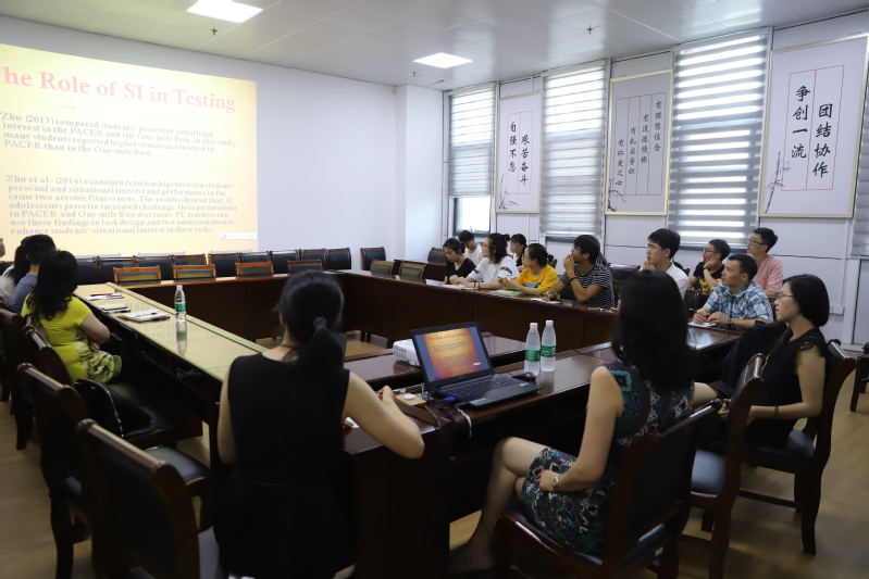 6月30日下午,美国南佛罗里达大学终身教授孙海春应邀为体育学院师生作了“情景兴趣在体育活动中的作用”的专题报告。体育学院党委书记张利先,副院长张矛矛,学院教师代表,部分研究生参加了报告会。报告会由张矛矛副院长主持。