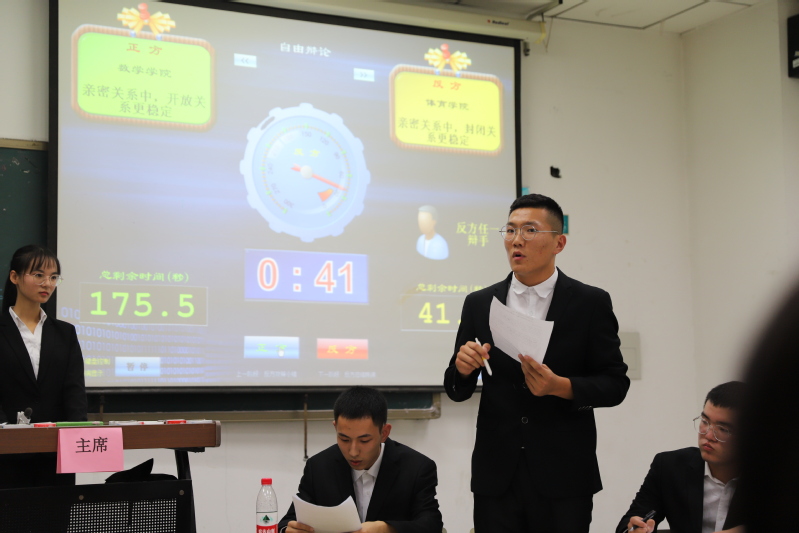 在对阵数学学院的比赛中,我方辩手据理力争、从容不迫,面对对手的压制能够冷静应对,抓住对手的思维漏洞迅猛反击。整场比赛高潮迭起,精彩不断,观众也积极参与,与选手们进行互动,现场气氛十分活跃。经过激烈的角逐,初来乍到的体育学院辩论队终究吃亏在自身经验不足,正方数学学院辩论队获得本次辩论赛的胜利,我院辩论队二辩选手庄子全获得本场最佳辩手荣誉称号。