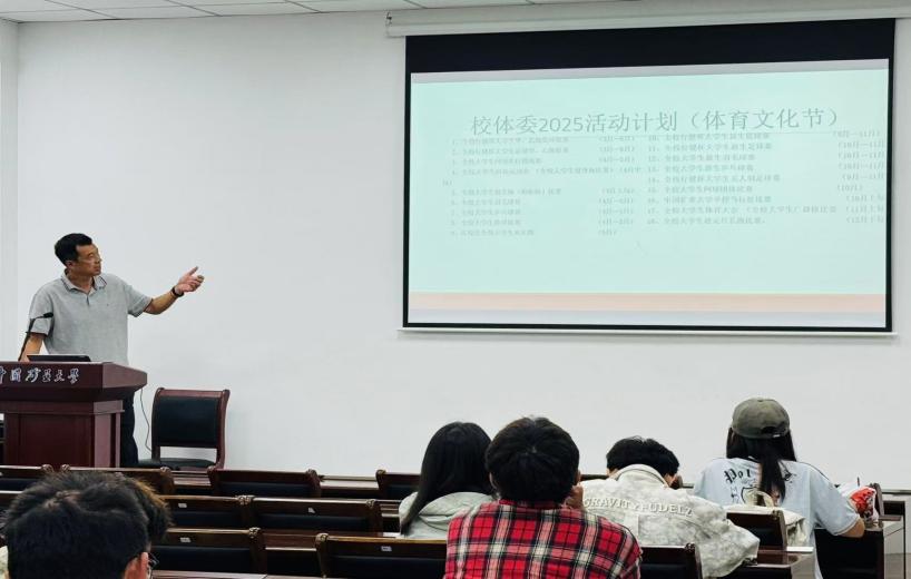 2025年9月12日,学生会体育部和体育协会负责人会议在体育馆B107召开,体育学院副院长张大中、体育群体中心负责人杨梦晓、及各学院学生会体育部部长、各体育协会负责人参加会议。