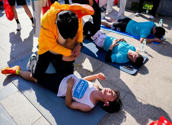 拉伸按摩服务从上午八点三十持续到中午十二时,共为800余名选手完成放松处理,成为本次赛事保障的新亮点。为保持服务质量,志愿者们全程在岗,通过专业的拉伸服务,保障了选手的健康和安全。不少选手完成放松后折返点赞:“感谢矿马,感谢志愿者,明年还来跑”!志愿者们用实际行动展现了中国矿业大学体育学院学生的活力与责任感,为校园文化的建设贡献了自己的力量。