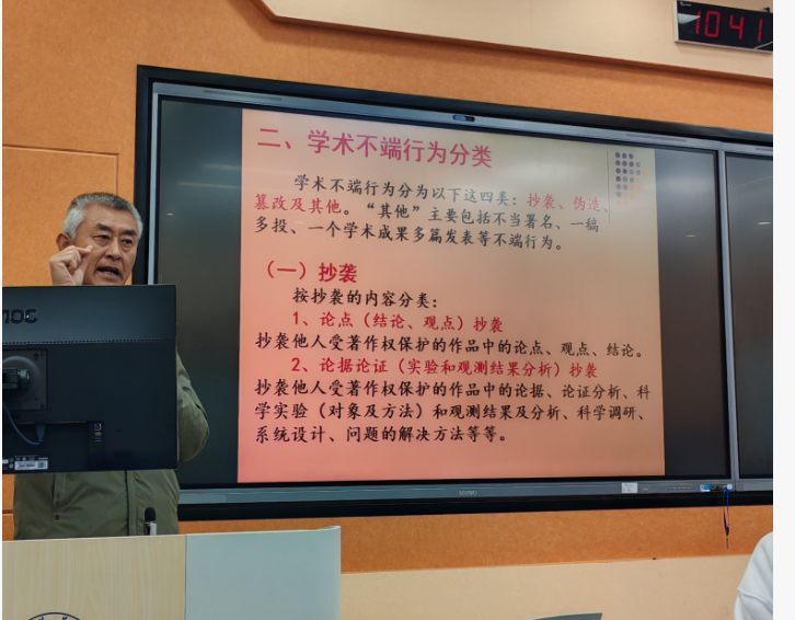 会上,项立敏教授首先介绍了学术不端行为的概念、分类、并列举了几种典型的高校学术不端行为,比如抄袭、剽窃、侵吞他人学术成果,篡改他人学术成果,伪造或者篡改数据、文献,捏造事实,伪造注释,不当署名等等。接着,项立敏教授讲授了学术道德及学术规范的重要性。项教授强调:“学术规范与学术道德关乎学术诚信问题,作为研究者一生都要坚守学术基本规范,守牢学术道德红线,将严谨的学术态度贯穿始终。”