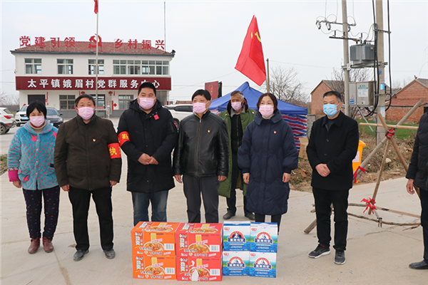 “你们在这么紧要的时候,舍小家、为大家,为我们的生命健康把好关口,我带点东西来看看大家,向你们致敬!”2月15日一大早,江苏省宿迁市泗洪县太平镇娥眉村疫情防控点,该村爱心企业家陈绍明带着10箱水果和50副手套从县城赶来,看望坚守一线的村干部,并捐款5000元。