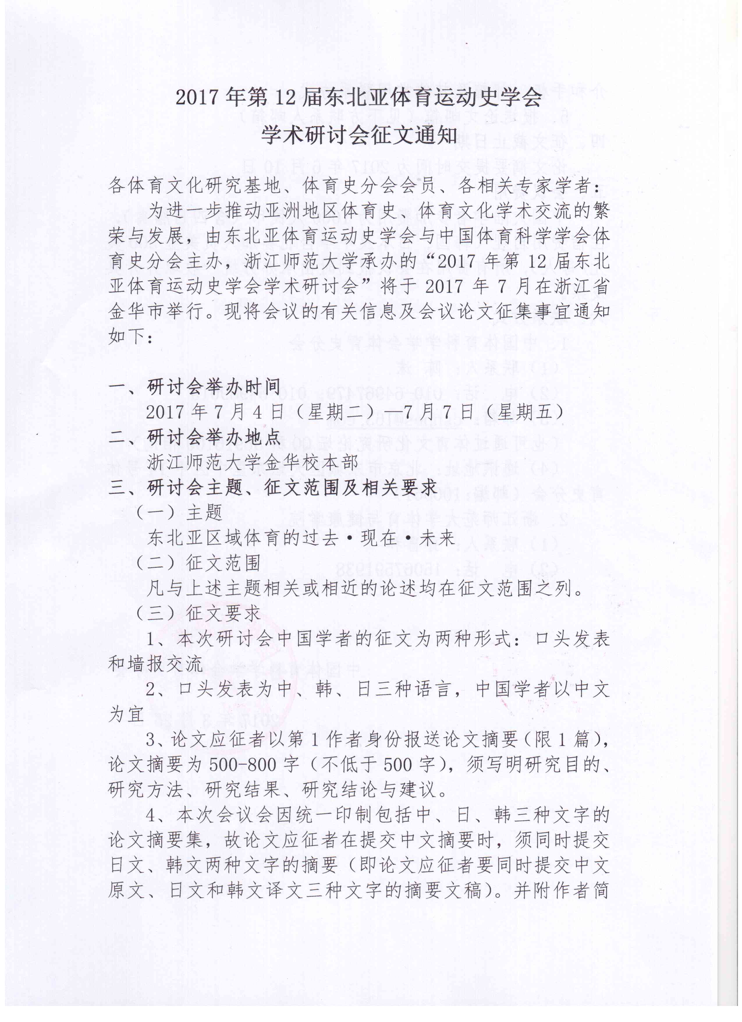 2017年第12届东北亚体育运动史学术学会研讨会征文通知(1)