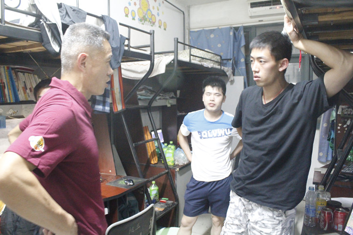 6月19日晚,体育学院党委副书记郭鹏,毕业班辅导员马英虎来到学院2010级学生宿舍——桃三C区四楼,一间间走访毕业班学生宿舍。