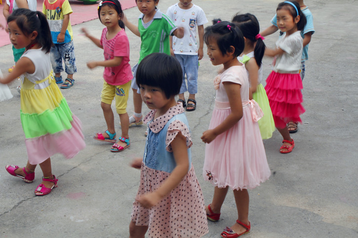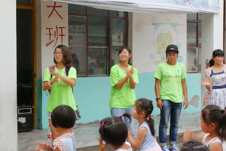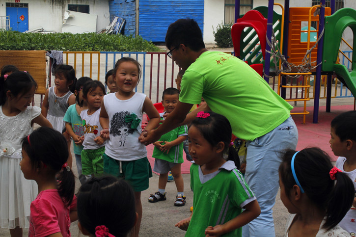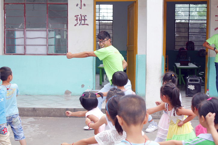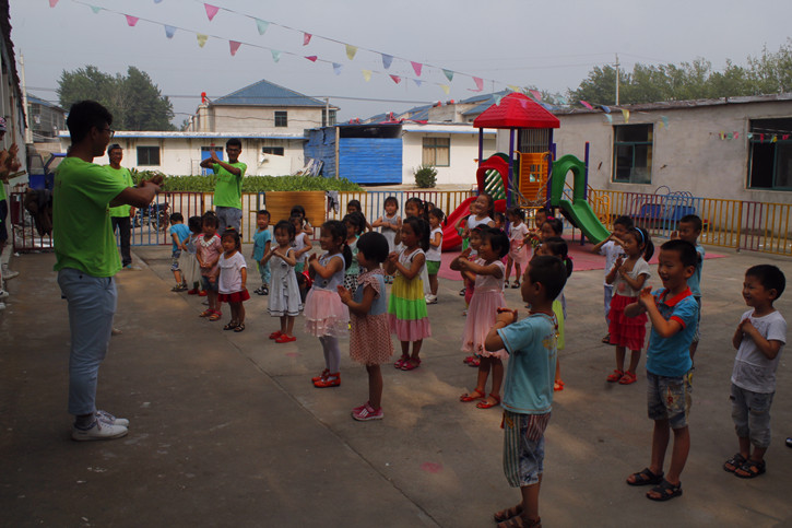 社会体育13-3班的吕理想曾经学过一段时间武术,他主动担当起孩子们的“武术启蒙老师”。立正、抱拳,虚部亮掌、并步对拳,一套动作演示下来,引得现场阵阵掌声。孩子们尤其是一些男孩表现出了极大的学习兴趣,并且有模有样地学了起来。随后,女队员们还编排了《小苹果》的健身操,现场一片欢乐。从教室走出来,孩子们和实践队员们都表现出了纯真的天性。