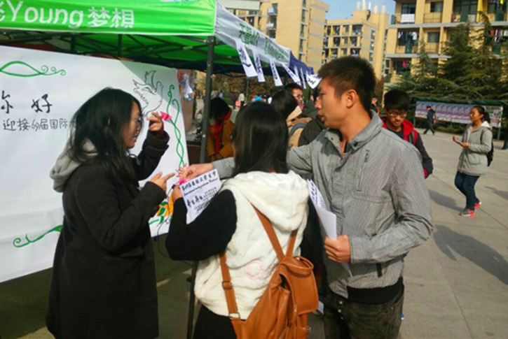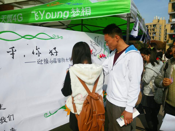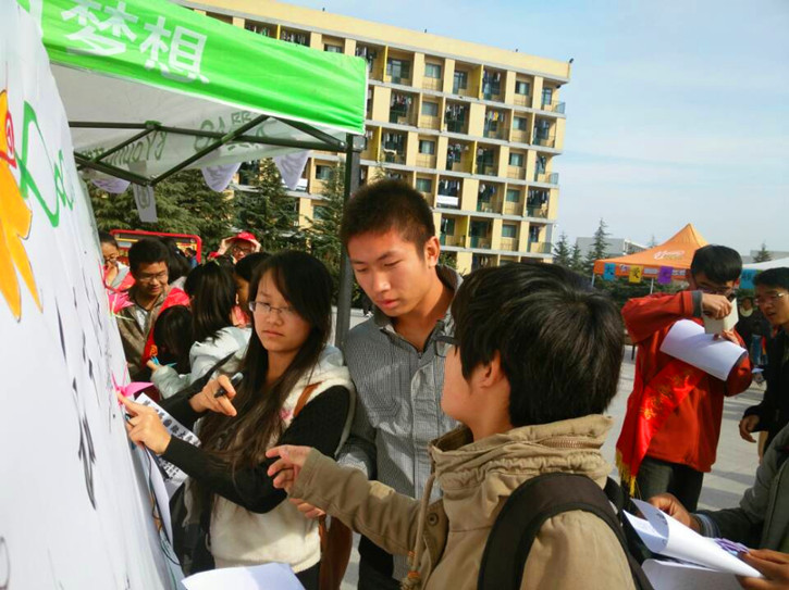 11月17日中午,体育学院青年志愿者协会和管理学院、化工学院青年志愿者协会在二食堂广场共同举办"和平,你好"志愿者活动,迎接"国际大学生节"的到来。