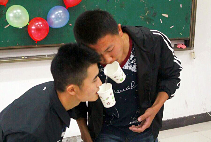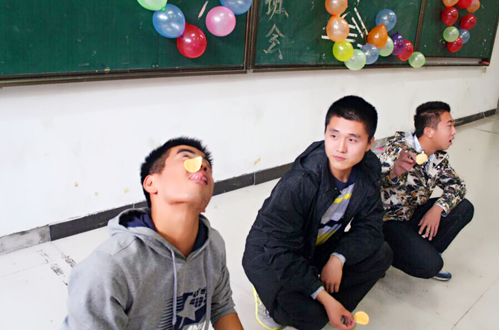 “衔水接力”是活动的第一项游戏,游戏规则为:先分组,站成一排,每人衔一纸杯在嘴中,第一个人水杯中装满水,依次将水倒给下一个人,全程必须用嘴,不能用手或其他物品。很快,同学们就自动分成了四个组,一个组八个人。第一组王子等人表现出色,最终以1分36秒结束了比赛。第二组发挥出色,最终以1分21秒完成了他们的配合。第三组由女生搭档,她们巾帼不让须眉,最终以1分12秒的成绩领先。最后一组吸取了前几组的经验,配合默契,最终以1分10秒的好成绩夺得第一。第二项游戏“挤眉弄眼”,张翔宇以6秒的成绩获得第一,而张帅与赵超鹏以一秒之差位居第二。之后,班迪同学播放了自己精心准备的PPT,大屏幕上的照片让大家重温了温馨的回忆。接着,班委和班长发言。最后,班主任贾俊飞说:“大家要相信自己,要努力拼搏,因为我们是最棒的、最优秀的班集体!”在全体合影留念之后,主持人宣布活动结束。