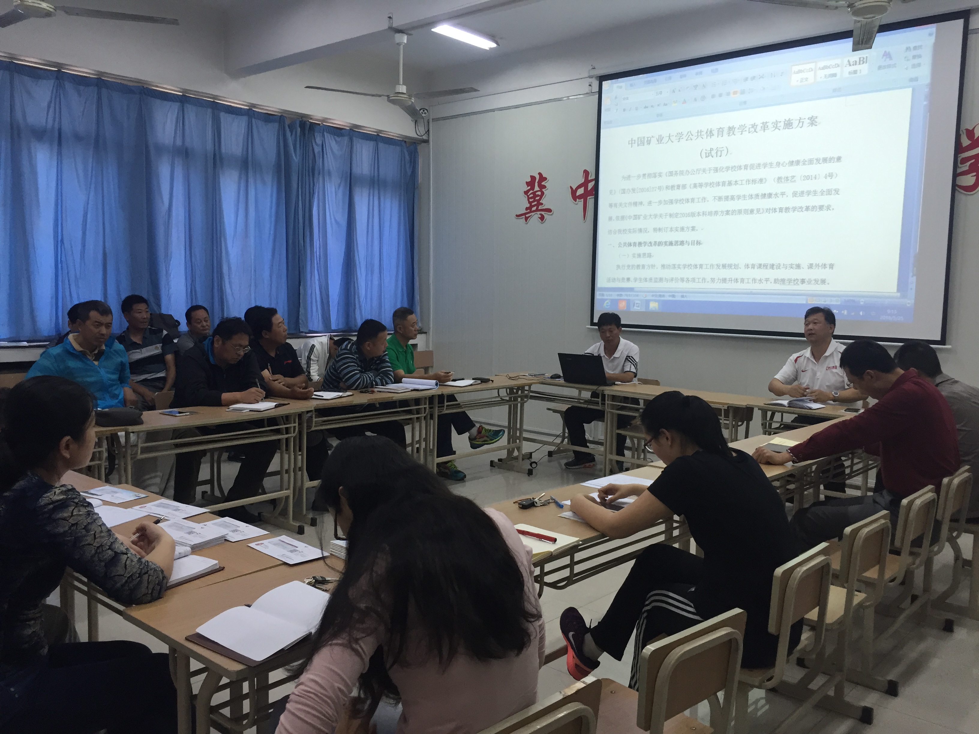 会上,公共体育系主任张玉超教授向全体教职工介绍了《实施方案》的内容,并逐一介绍了改革要点。王朝军院长向学院教职工通报了《实施方案》的制定过程。他指出,为了更好地推进学校公共体育教学改革,相关部门在进行方案设计的基础上,先后多次召开不同层面、不同范围的意见征集会,听取专家、教师以及学生提出的修订意见,并不断地修改完善。与此同时,为了保证《实施方案》的操作性,学院还派负责老师外出进行调研、考察,最终形成了《实施方案》的试行稿。