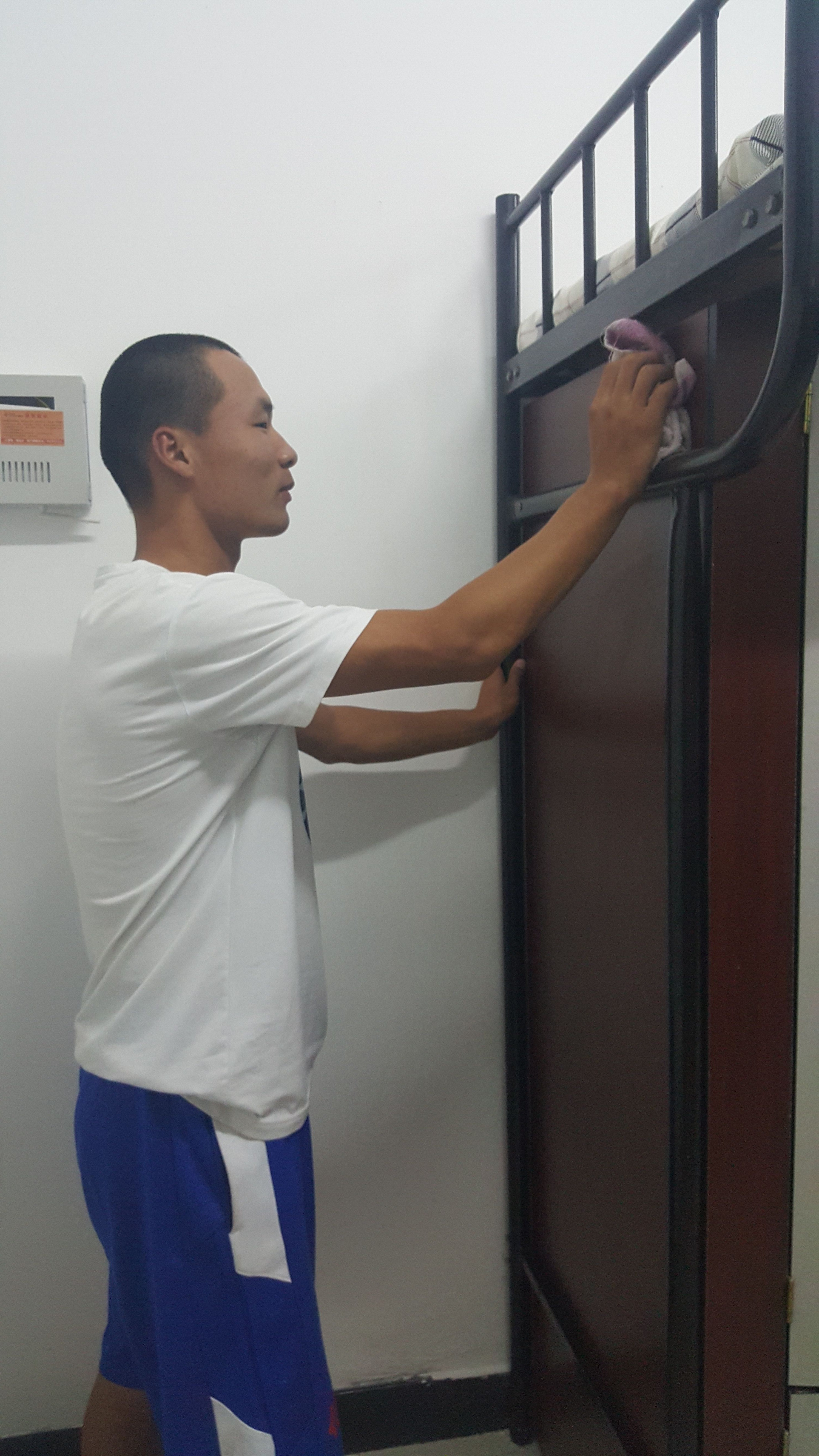 9月11日晚7点,体育学院全体大一新生在学长学姐的指导下继续开展内务整理活动。新生们认真地打扫着寝室的每个一角落,尤其是日常物品的摆放。学长学姐们亲自为新生们师范如何做到宿舍内务整理标准条例,不放过任何一个细节,认真得对新生的内务整理进行指导。虽然新生们已经经过了一天高强度的军训,但仍积极地对待内务整理,积极分工合作,力求把寝室打扫干净。有的人在扫地,有的人在擦玻璃,还有的在打扫阳台。忙得不亦乐乎。