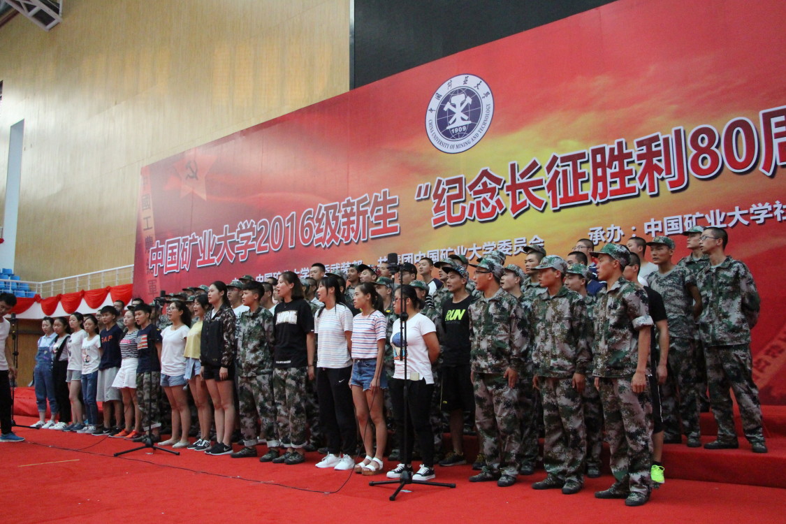 彩排开始,根据站位女生在前,男生在后。排练的两首歌曲是《中国矿业大学校歌》以及《长征组歌之突破封锁线》。在演唱时,2016级新生唱的浑厚有力,充分展现了体育学院的活力与热情。经过长期刻苦的训练,2016级新生已经能够将歌词与音调相结合,唱出底气与水平。