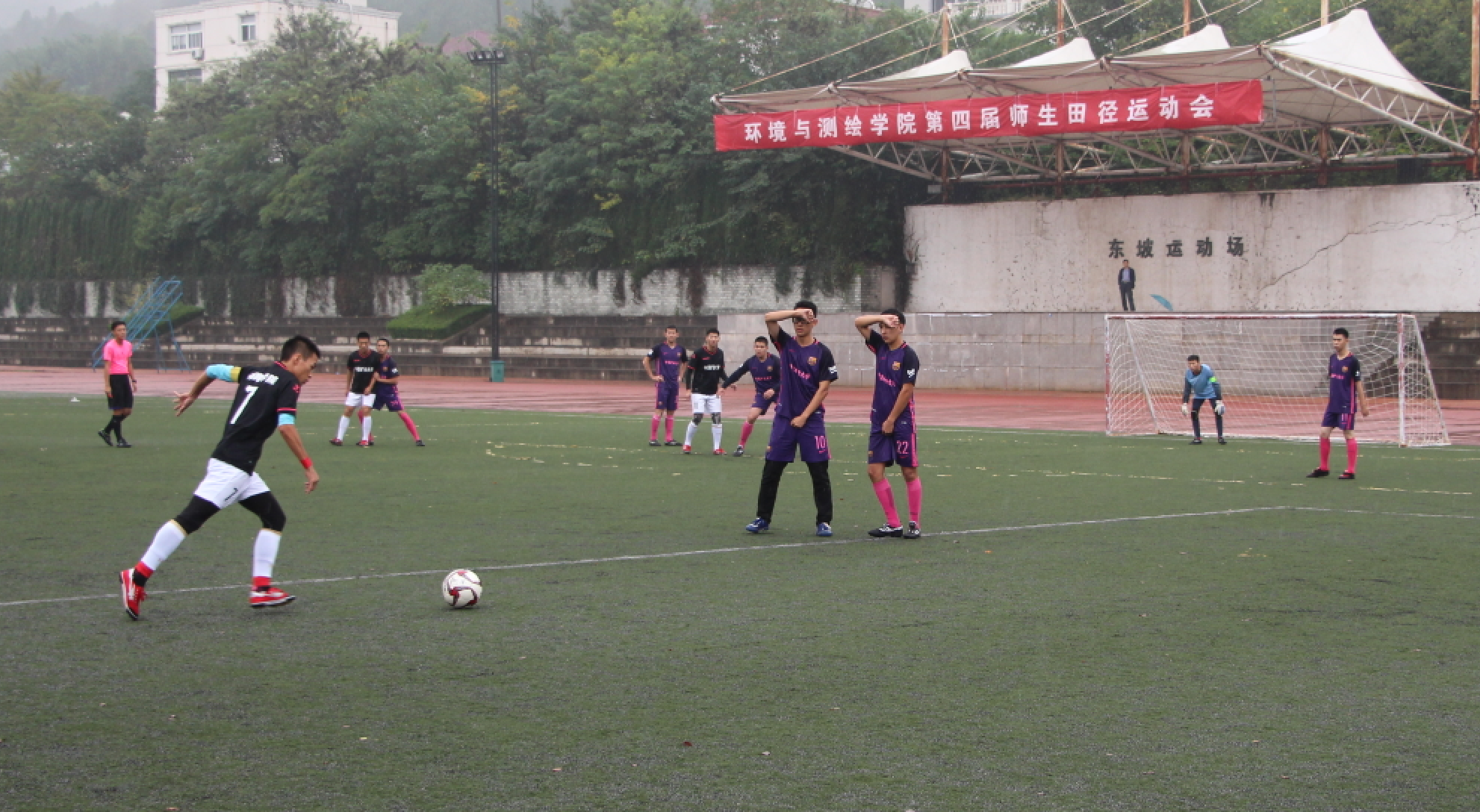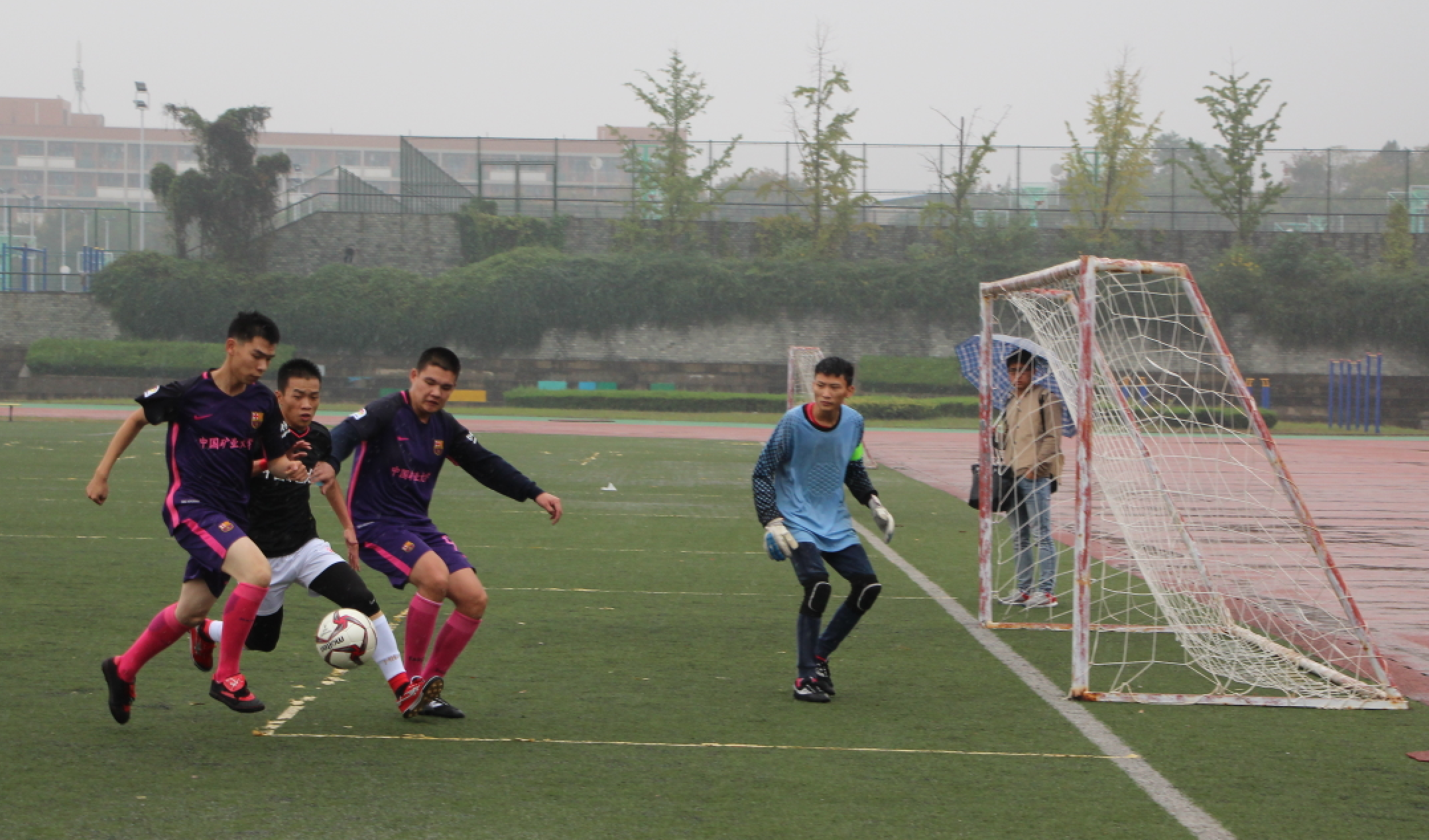 随着裁判的哨声,比赛开始。管理学院组织第一次进攻机会,但在体育学院队员们的积极防守中,无所突破。双方队员迅速进入状态,比赛持续升温,在进行到第18分钟时,体育学院获得角球机会,由体育学院7号陈圣文开出角球,造成了管理学院的禁区手球,体育学院获得点球机会。陈圣文抓住机会,开脚射门,球穿过守门员稳稳地飞进球门,僵局被打破,体育学院以1:0暂时领先对手。下半场一开始,体育学院就全线压进,管理学院不甘示弱,积极防守,力保球门不失。比赛进行到第33分钟时,体育学院7号陈圣文持球突破。连续假动作,晃过对手,右脚抽射,球飞进球门。陈圣文梅开二度,帮助体育学院2:0领先对手。