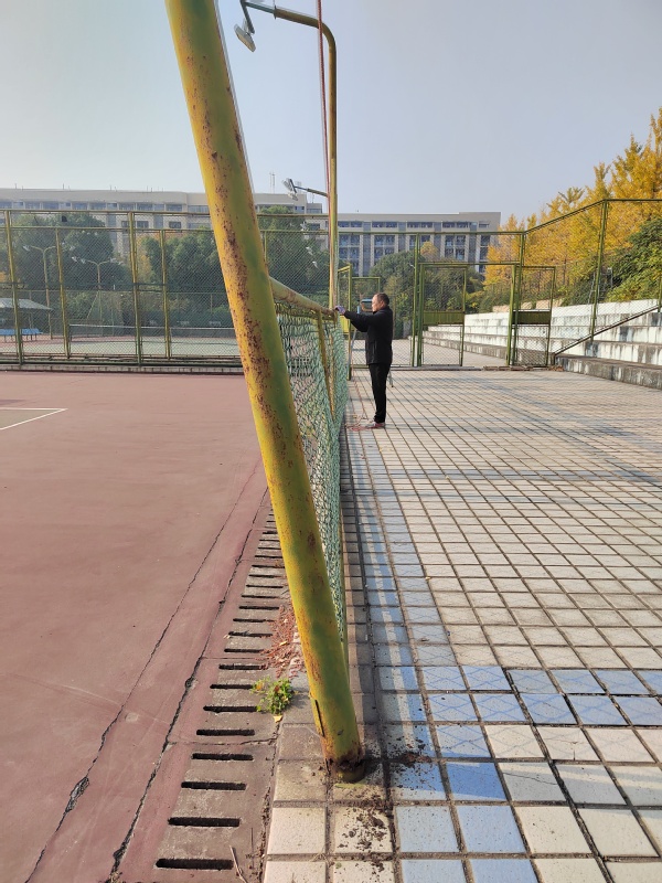 本次重点对公共体育教学场地设施进行检查,通过仔细巡查,检查人员发现网球场中个别灯柱底座锈蚀严重,存在较大安全隐患。针对该问题,学院立即启动应急处置方案:一方面,要求场地管理员及时提醒上课和锻炼的师生,远离此片场地,注意人身安全;另一方面,联系有关人员立即开展维修工作,用最快时间对问题部位进行加固,及时消除安全隐患。