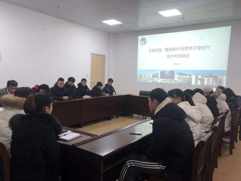 1月10日上午,体育学院在会议室举办“镜湖有约•优秀学子母校行”院内专场培训会,所有申报团队负责人参加了培训会,学院团委书记曹杏利主持此次培训会。