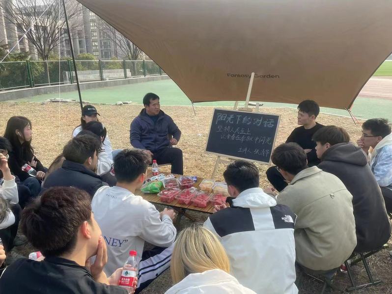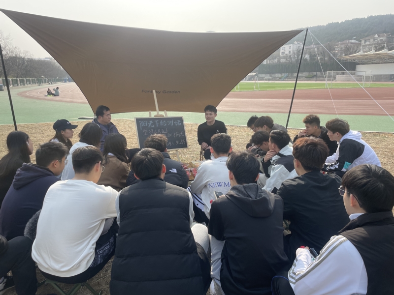 3月5日下午,体育学院在东坡运动场开展了第一期“阳光下的对话——坚持人民至上,让青春在奉献中闪光”活动。本次活动由院党委委员、体育系主任张清华老师担任主讲,院团委书记、辅导员刘邦舜老师和学院团学骨干一起参加了活动。