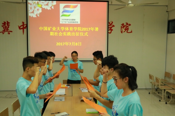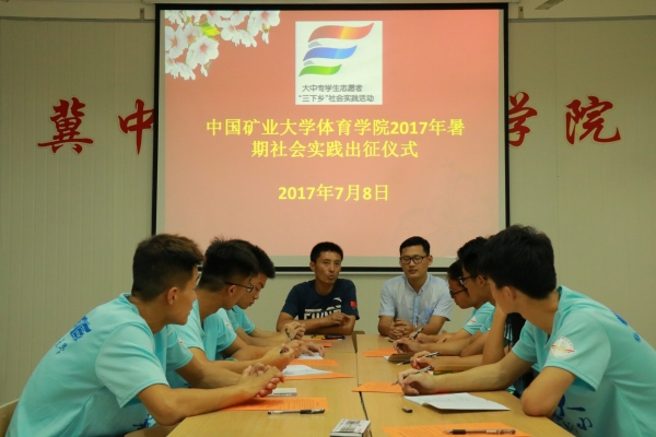 7月8日晚,体育学院在学院会议室举行了2017年“助力在行动,筑梦到基层”省级暑期社会实践活动出征仪式,学生工作办公室主任马英虎老师同全体实践团成员参加了出征仪式。仪式由马英虎老师主持。