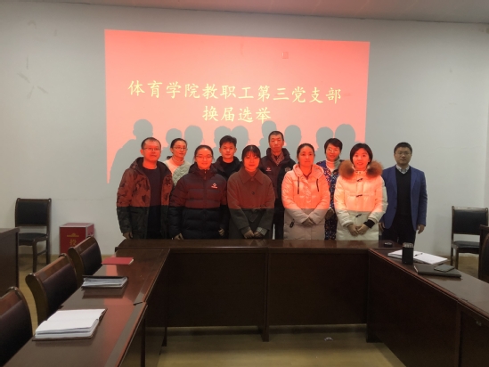 2020年12月29日上午,体育学院教职工第三党支部举行支部委员会换届大会。院党委书记张利先对支部换届工作提出了要求,支部全体党员参加会议,会议由支部书记宋春景主持。