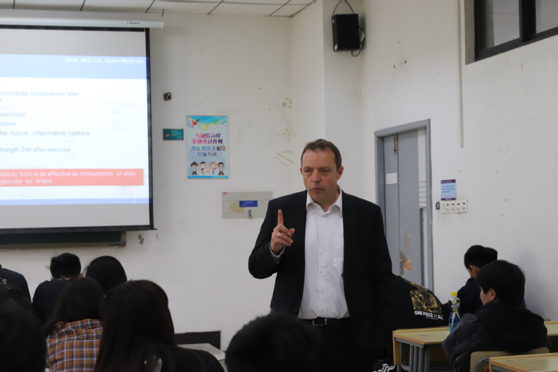 讲座中,迪尔教授为同学们展示了德国科隆体育大学的教学环境、教学氛围以及近阶段的研究重点。他指出,近期实验研究表明,将吊带训练与营养蛋白和碳水化合物的食物提取相结合,可能是抵消与年龄有关的力量与肌肉质量损失的有效策略,从而可提高老年人的生活质量。